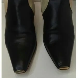 Pointed toe, sculpted kitten heel, gold buckle detail.