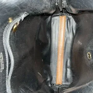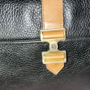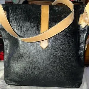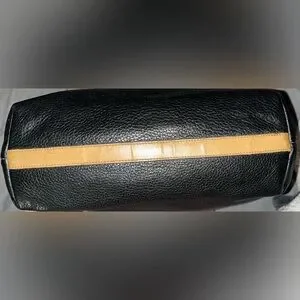 Stylish black leather bag featuring a tan accent. Perfect for everyday use. Durable and elegant design.
