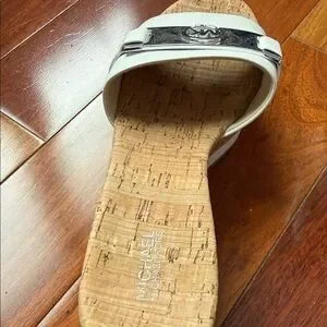 Step out in style with these chic Michael Kors white slide sandals. Perfect for any casual outing. Silver hardware
