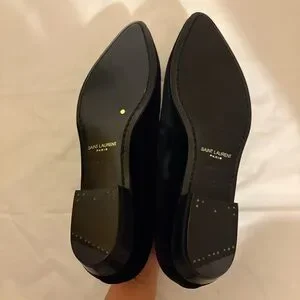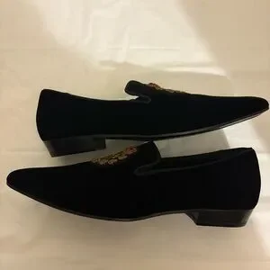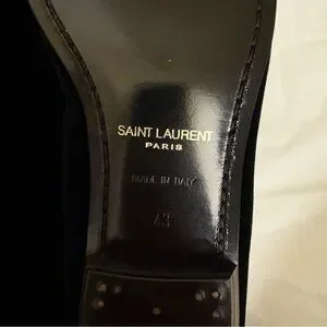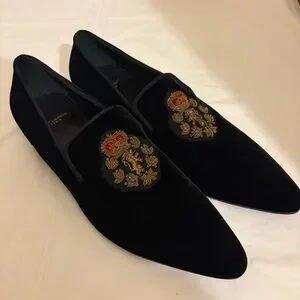 NWOT SAINT LAURENT mens velvet loafers // size: 43 (US 10) // slim shape with point toe // embroidered crest design on the vamp // new, never worn // the left side of the right shoe has a tiny area where the velvet fibers are pressed (pictured) // includes original dust bags //