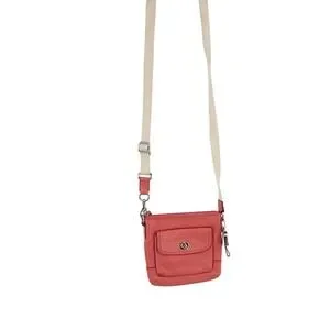 Coach crossbody bag crafted from pebbled leather in a vibrant coral pink hue. This functional accessory features a secure top zip closure and a front flap pocket with a signature turnlock detail. The adjustable canvas webbing strap in a neutral cream tone allows for comfortable shoulder or crossbody wear. Finished with silver-tone hardware and a classic leather hangtag, this compact bag provides a stylish solution for carrying daily essentials.