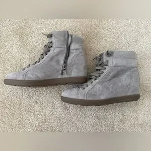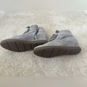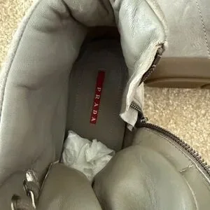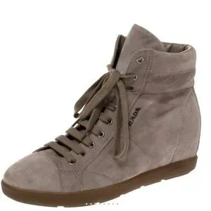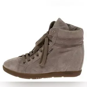 Chic Prada high-tops in soft gray suede. Perfect blend of style and comfort. Ideal for casual wear.