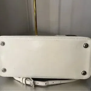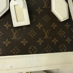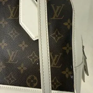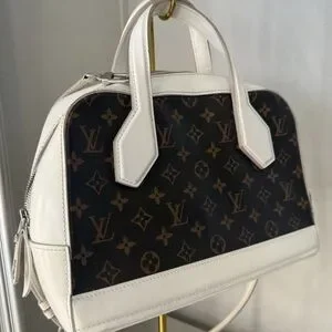Chic Louis Vuitton satchel with iconic monogram. Features brown canvas and white leather accents. Stylish and timeless design.