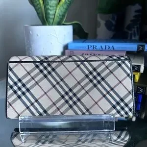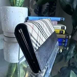 Elegant Burberry wallet with iconic check pattern. Features black leather trim.