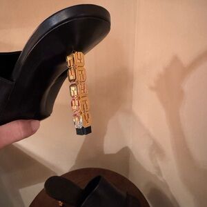 Chic black mules featuring a striking gold heel. Perfect for elevating any outfit.