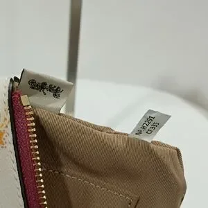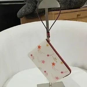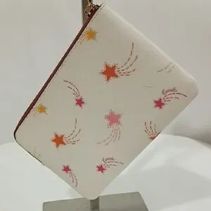 Chic Coach wristlet in cream. Features vibrant star pattern. Includes wrist strap for easy carrying.