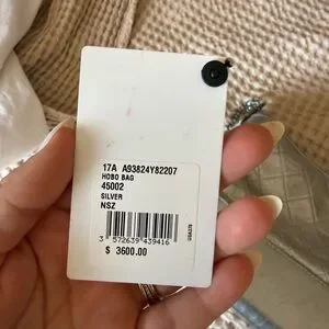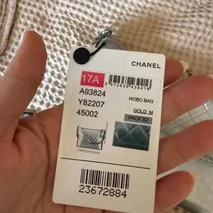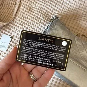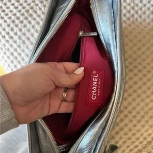 Chic Chanel crossbody in metallic silver. Features quilted design and chain strap. Ideal for stylish outings.