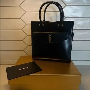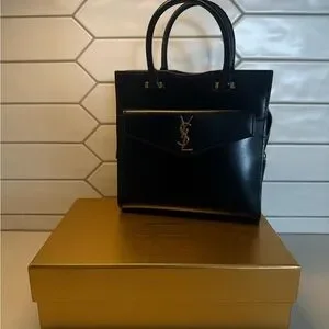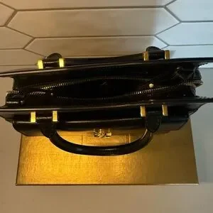Chic black satchel with iconic gold logo. Sleek design for versatile style. Perfect for day or night.