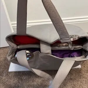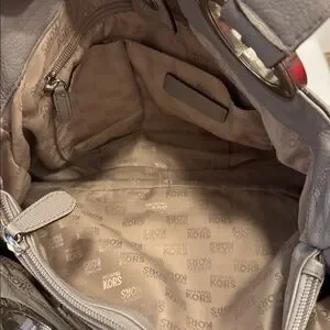 This is a Michael kors silver logo grey shoulder bag. It several interior pockets and is in great shape. It measures 15” x 11” x 4.5”.