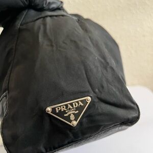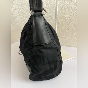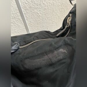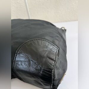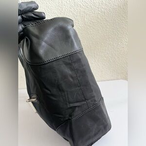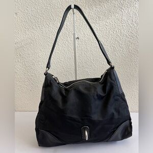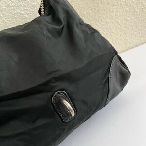 Exterior is made with nylon, features top zip closure, leather handle, leather trim, metal fitting, missing flap cover.