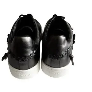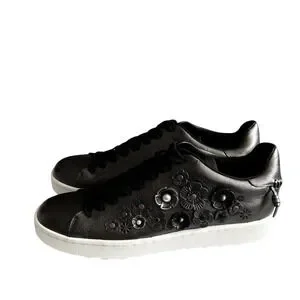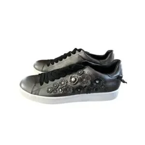 These Coach Tea Rose Gunmetal Metallic Leather Sneakers are a rare and stylish statement piece. Crafted from premium gunmetal metallic leather, they feature signature Tea Rose floral appliqués with stud and grommet embellishments for a unique, high-fashion look. The sleek low-top silhouette, contrasting white rubber sole, and lace-up closure provide a perfect balance of luxury and casual wearability. These sneakers are ideal for adding a touch of edge to any outfit, from denim to dresses.