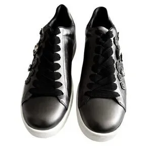 black floral leather sneakers, embellished sneaker style, edgy feminine footwear, dark romantic aesthetic, rocker chic sneakers, luxe casual streetwear, monochrome statement shoes, modern gothic casual, fashion sneaker with embellishment, elevated everyday sneaker, minimalist luxe street style, black on black fashion shoes, city chic sneakers