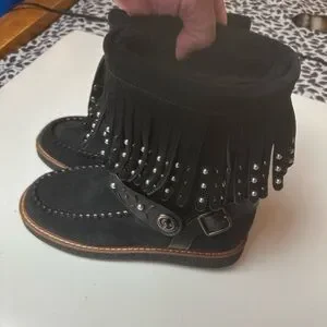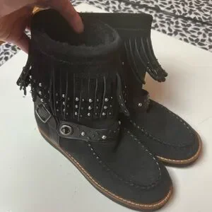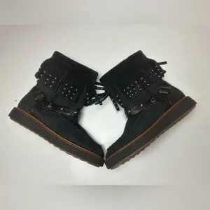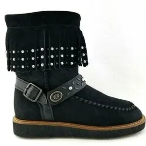 COACH ROCCASIN Black, Fringe, Silver Studded, Suede, Shearling Moccasin Boots. NWOT, Size 7