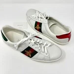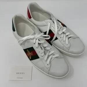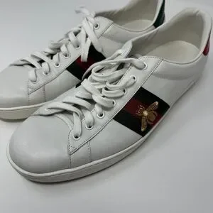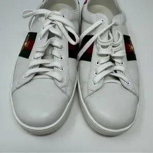 GUCCI Ace Embroidered Gold Bee White Sneakers with Red and Green Stripe