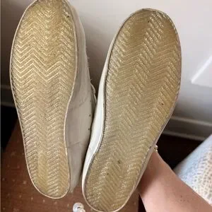 Stylish Golden Goose sneakers. White leather with beige accents. Iconic star design. Comfortable and trendy.