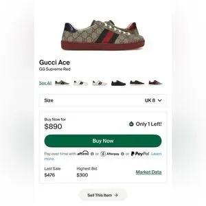 GUCCI ACE GG SUPREME RED SNEAKER | SIZE 8G 9US | 429445 | No box | ships boxed immediately with care | resells for $890 | my price $340 | send offers!