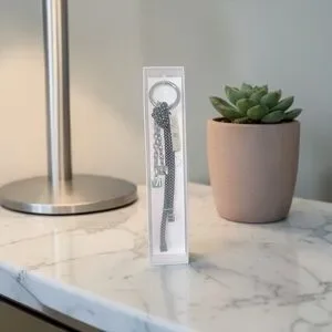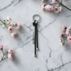 This elegant MK keychain features a sleek black design with silver accents, perfect for adding a touch of sophistication to your accessories collection.