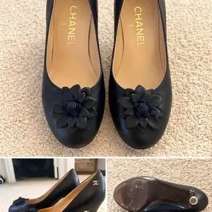 Elegant and timeless Chanel pumps crafted in smooth navy leather with signature camellia flower detail at the toe. A classic round-toe silhouette paired with a sleek mid-to-high heel makes these perfect for both formal occasions and polished everyday wear.