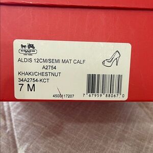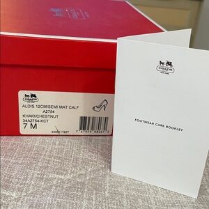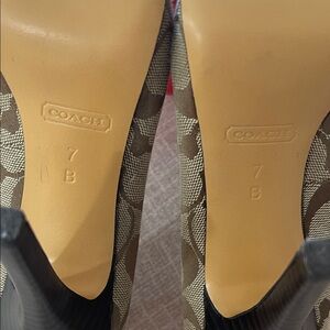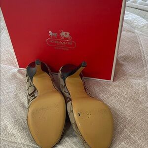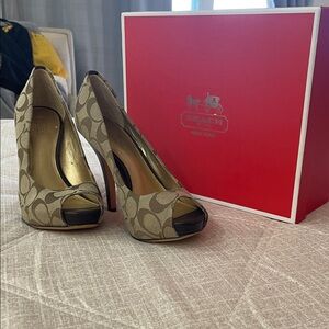 Elevate your look with these stylish Coach heels. Tan pattern adds a sophisticated touch. Perfect for any event. Original box and care booklet included.