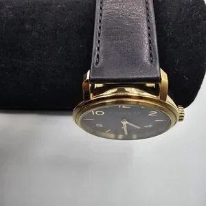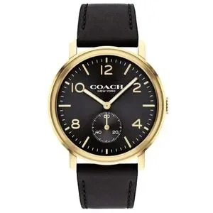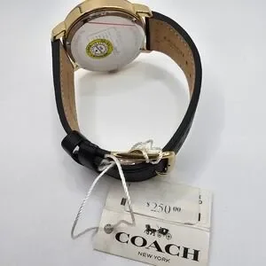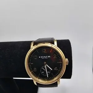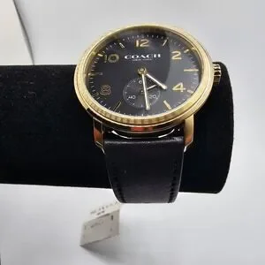 Coach Harrison men's watch features a sophisticated 42mm gold-tone case paired with a black dial and genuine leather strap, offering a timeless aesthetic for professional or formal wear. No box or paper