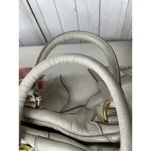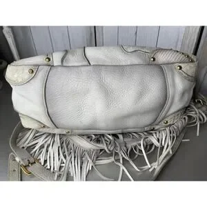 Creme and taupe pebbled leather Prada Cervo Antik Fringe Bowler Bag with gold-tone hardware, snakeskin trim at sides and base, gold-tone circular embellishments throughout, optional fringe shoulder strap, additional adjustable leather shoulder strap, tonal woven lining, two pockets at interior walls, one with zip and zip top closure.