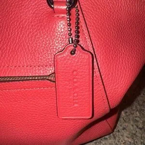 Chic Coach satchel in vibrant cherry red leather. Features sturdy handles and a sleek design. Ideal for everyday elegance. Could use a light cleaning on the inside all zipper closures work.