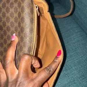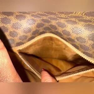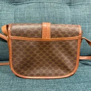 Elegant Celine crossbody bag in brown with a subtle pattern. Features a sleek leather strap and gold-tone buckle.