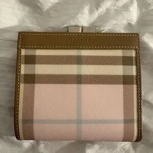 Chic Burberry wallet with pink and brown checkered pattern. Compact and stylish.
