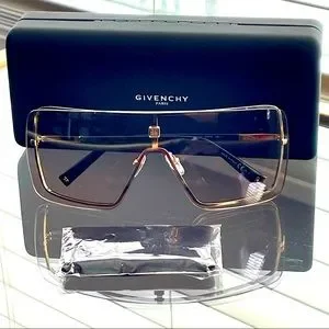 New Givenchy Sunglasses elevate your street style with futuristic, floating-lens shield sunglasses featuring polished-logo details at the temples.