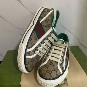 Elevate your look with Gucci sneakers. Tan with iconic logo pattern. Green accents add a bold touch. Perfect for casual wear.