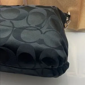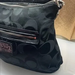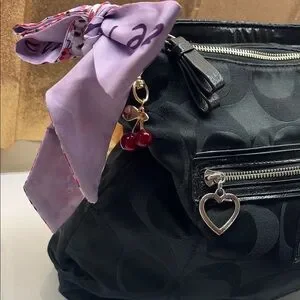 Chic black Coach bag with signature pattern. it comes with the cherries and the mini purse scarf. Comes with the original long strap. Features a playful floral scarf accent. Perfect for versatile styling.