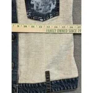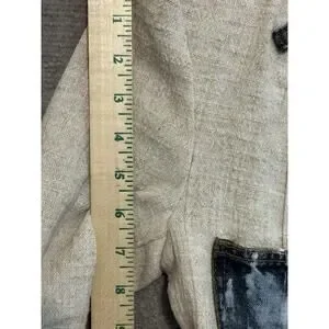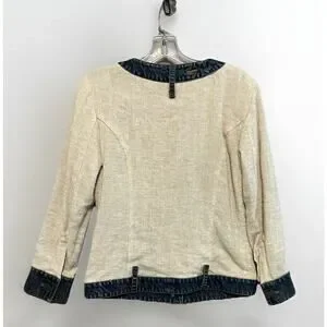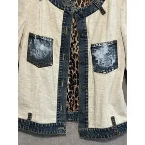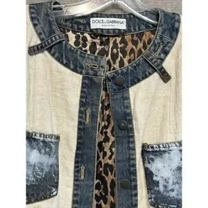 Dolce & Gabbana linen jacket with distressed denim contrast. Leopard lined in viscose. Edgy belt loop accents and branded rivet closure. Iconic Dolce Gabbana. Dry clean. Eu 40, measures US 6. Please check measurements in pics.