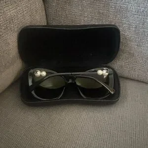 Excellent condition, oversized Chanel Sunglasses in black with beautiful pearl detail on the sides. Comes with protective case. No flaws or signs of wear.
