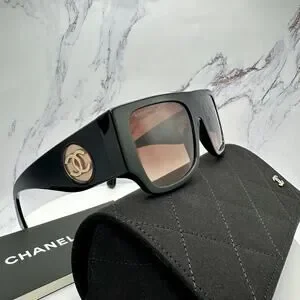 CHANEL Sunglasses Black Square Shield Gold CC Gradient Brown Lens