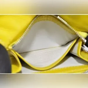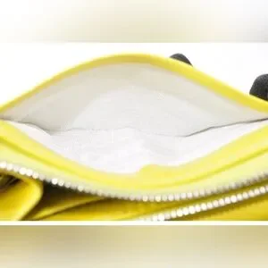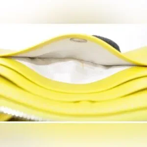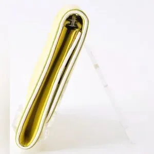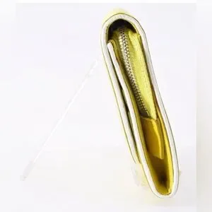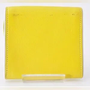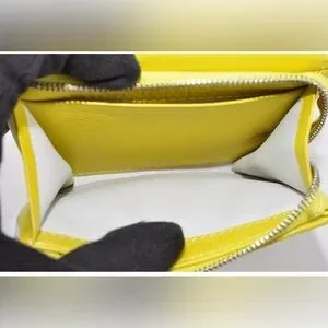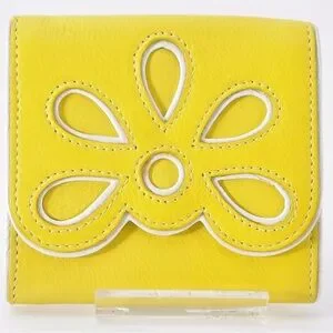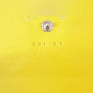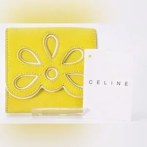 Chic yellow wallet with floral cutout design. Ideal for essentials. Designer is Celine. The callout is rubbing on the top of the wallet.