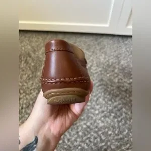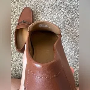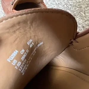 In gently used pre owned condition. Has several cosmetic scratches and marks on the shoes, some leather cleaner may help buff those out if you wish. On one shoe, the side is slightly bent. In great condition otherwise! Barely worn! Please see all photos of condition.