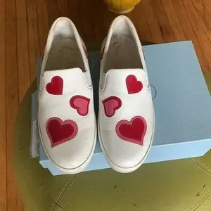 Stylish Prada sneakers with red heart accents. Slip-on design. Perfect for casual wear.