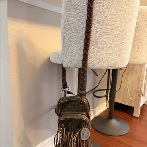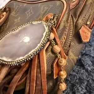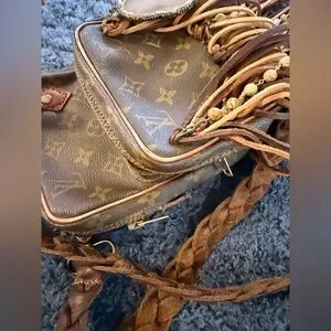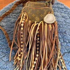 Classic Louis Vuitton monogram crossbody with layered leather fringe. Beaded accents and a polished stone charm add boho flair. Adjustable braided strap for versatile wear. Timeless monogram pattern suits casual looks.