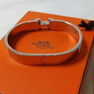 Signature Hermes cuff with white enamel panels. Polished silver-tone metal and H clasp detail. Sleek, minimalist design for versatile wear.