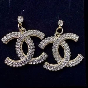 CHANEL logo drop earrings in gold tone with clear crystal pavé. Sparkling double C design. Secure stud backs. Glamorous statement accessory. Stamping on backside says Chanel