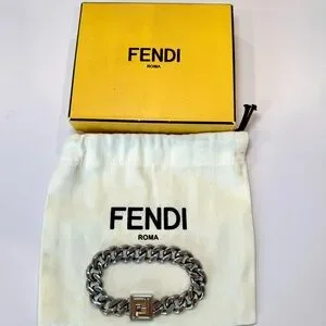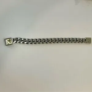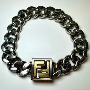 Fendi FF Logo Chain Bracelet In Palladium Silver And Gold Tone, Size Small. This gorgeous bracelet from Fendi featuring the iconic FF logo is sure to enhance any bracelet stack, or is classic enough to be worn alone! This bracelet is in excellent overall condition, but has minor hairline scratches throughout and minor marks on the clasp, all of which are largely unnoticeable when worn. Comes with original Fendi box and dustbag.