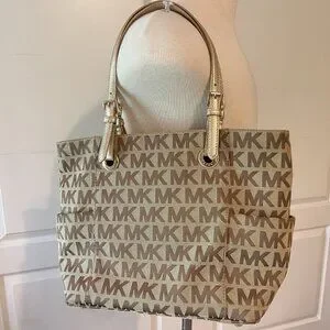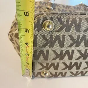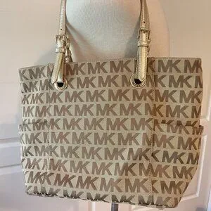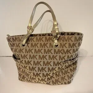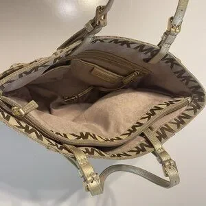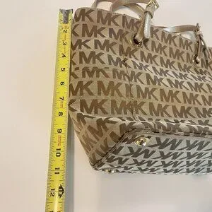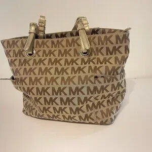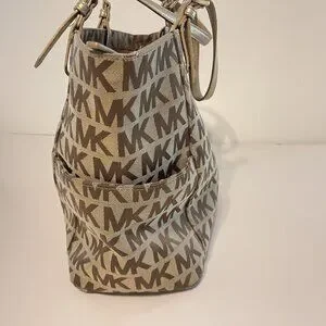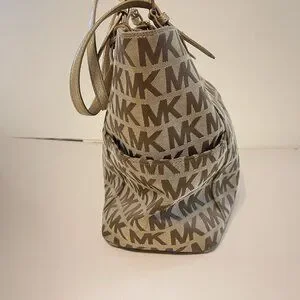 Michael Kors Jet Set Signature Logo Tote Handbag Large Brown Side Pockets