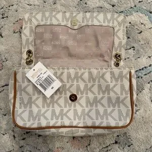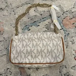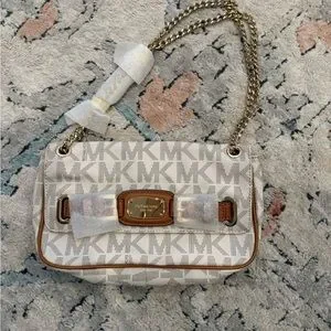 Chic Michael Kors shoulder bag in cream with gold chain strap. Features signature MK pattern.