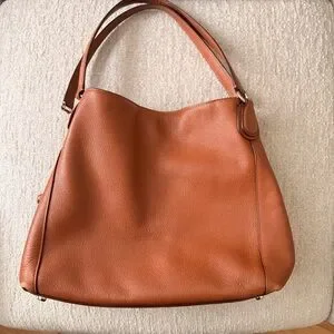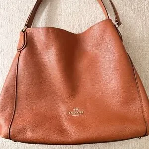 This Coach Edie Shoulder Bag in a saddle tan brown polished pebble leather is a great every day spacious bag. Beautiful neutral tone that matches lots of outfits. Ideal for traveling too.