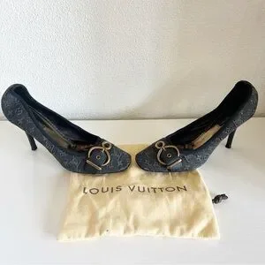 Elegant vintage Louis Vuitton monogram heels featuring the iconic LV canvas and a striking gold-tone buckle detail across the toe. This timeless pump blends classic Louis Vuitton heritage with a refined, feminine silhouette.