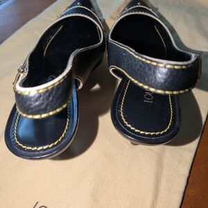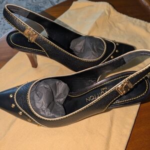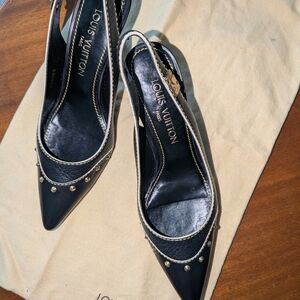 The Louis Vuitton Black Slingback Studded Heels in size 37 are a luxurious pair of women's shoes designed for fashion-forward individuals looking to make a statement. The stiletto heel and pump style offer a sleek and sophisticated look, perfect for summer and spring occasions. Made of black leather with studded accents, these heels are both stylish and durable, featuring a leather lining and insole for comfort. The iconic Louis Vuitton brand adds a touch of exclusivity and prestige to any outfit. Needs a tip on the heel of 1 shoe otherwise in Excellent condition. Come w/ dust bag.