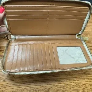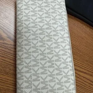 Michael Kors Beige Logo Wristlet with Brown Strap/jet set travel large