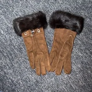 Coach Elegant brown suede gloves with a soft black fur cuff. Stylish buckle detail adds a refined touch. Warm and comfortable for everyday wear. Versatile design pairs well with many outfits.