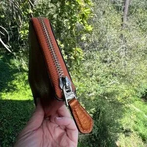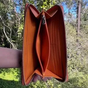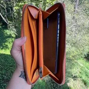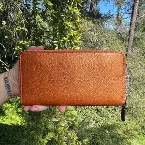 Keywords: Coach wallet, zip around wallet, accordion wallet, pebble leather, papaya orange, wristlet clutch, women’s wallet, silver hardware, zip coin pouch, card slots, bill compartments, logo front, gusseted interior, solid orange, designer accessory
