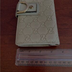Elevate your everyday essentials with this authentic Gucci wallet in a timeless beige GG monogram leather. Featuring a gold-tone D-ring buckle engraved with "GUCCI" and a sleek leather strap detail, this piece blends iconic branding with understated elegance.